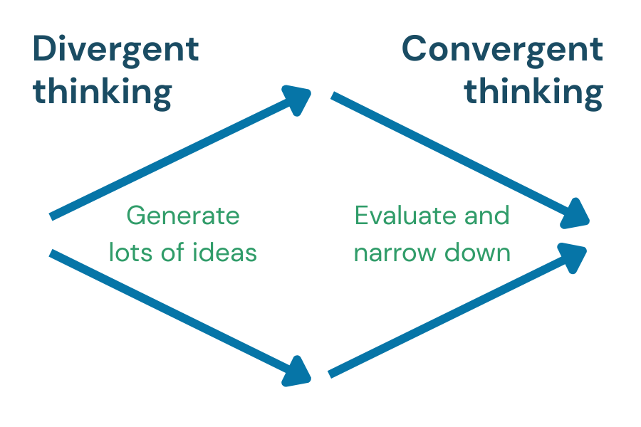 This first phase focuses on what’s called “divergent thinking”: coming up with as many ideas as possible without judgment. Just let the ideas pour in.
